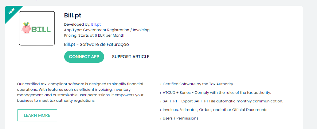 Navegue até a página Apps & Marketplace e procure por Bill.pt na barra de pesquisa.