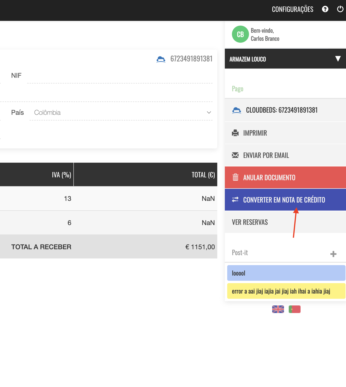 Assim que o documento estiver aberto, no menu à direita, clique na opção: "Converter em Nota de Crédito".