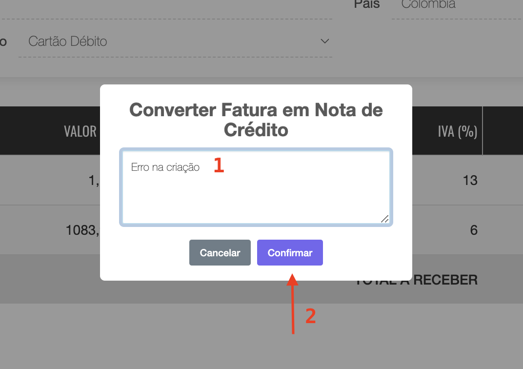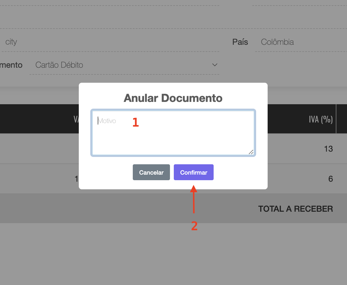 Após clicar em "Anular Documento", forneça a razão para anular esta fatura e clique em "Confirmar".