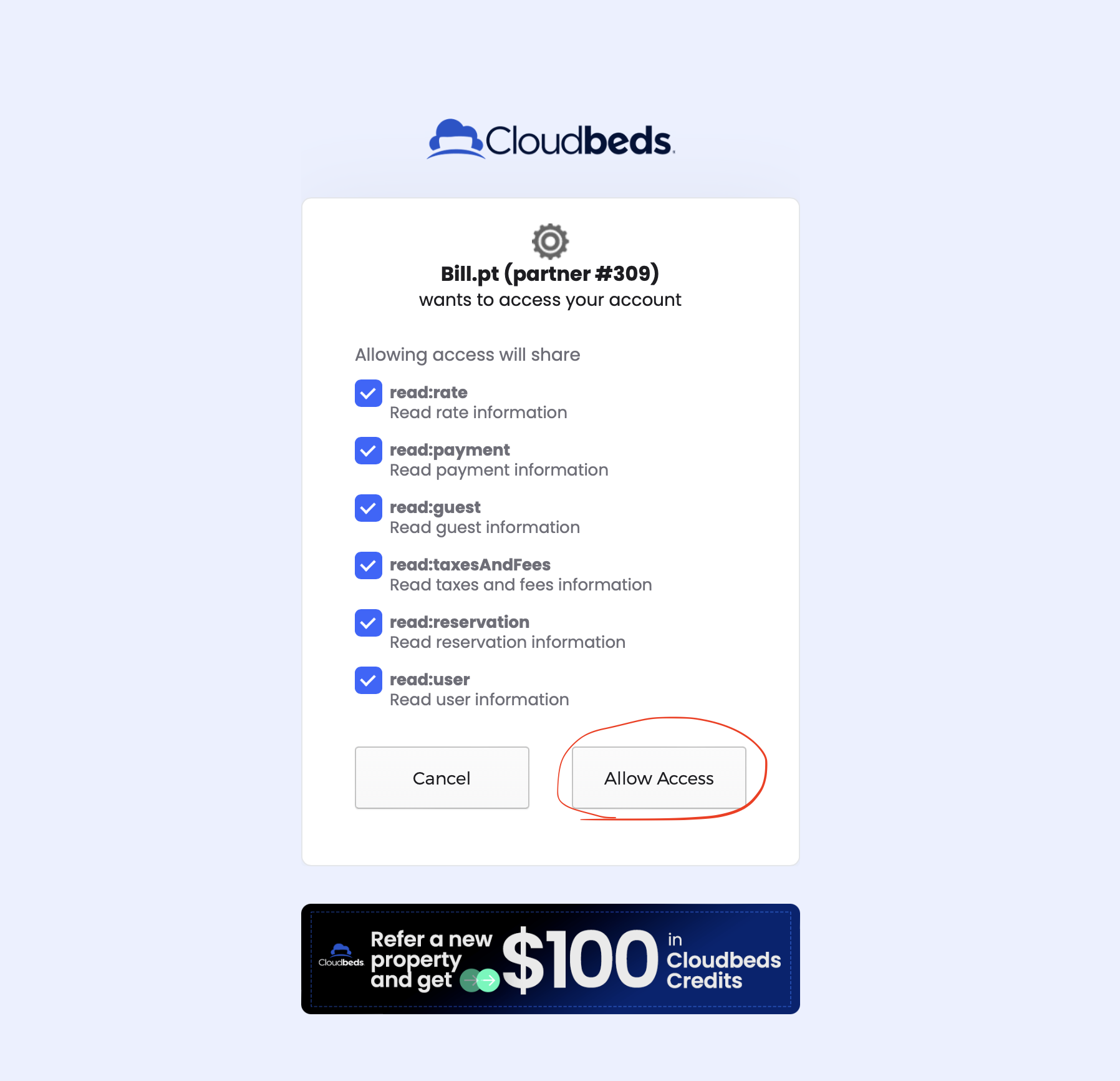 Posteriormente, faça login na sua conta Cloudbeds e conceda as permissões. Após aceitar, você será redirecionado de volta ao Bill.